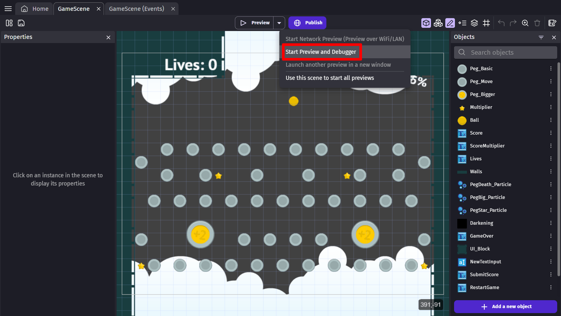 This is especially useful when you want to make tweaks to your game, like changing the parameters of effects or the properties of the behavior of an object, and see the result immediately. It's also useful to check how your events are working without restarting your preview from the beginning.